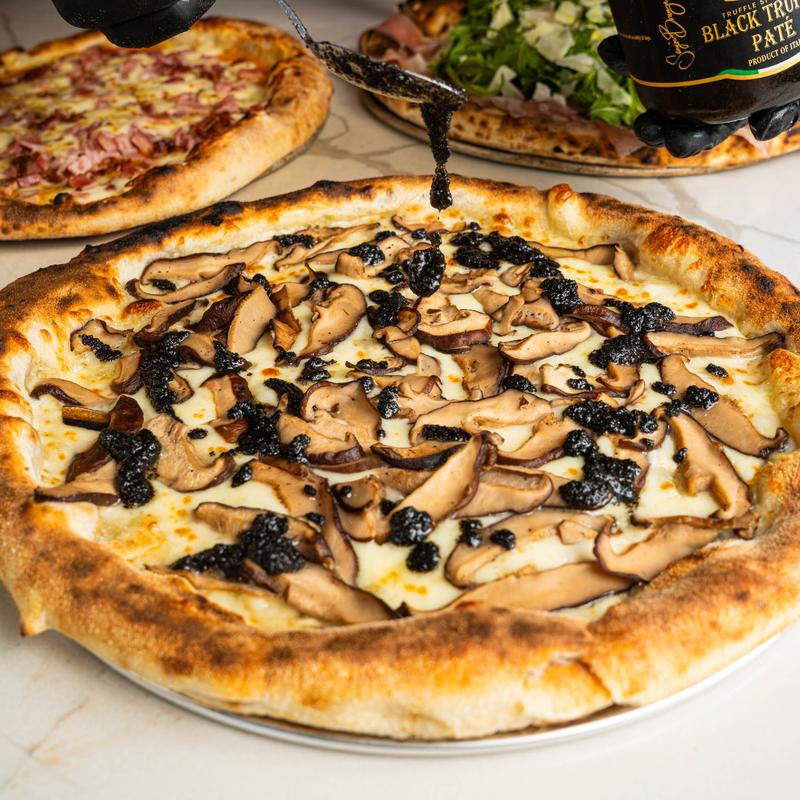 A rich and creamy blend of Grana Padano, fresh mozzarella, and Ricotta cheeses, infused with cracked black pepper and layered over a thin, golden-baked crust. Finished with a delicate drizzle of extra virgin olive oil and a dusting of aged Parmesan shavings.